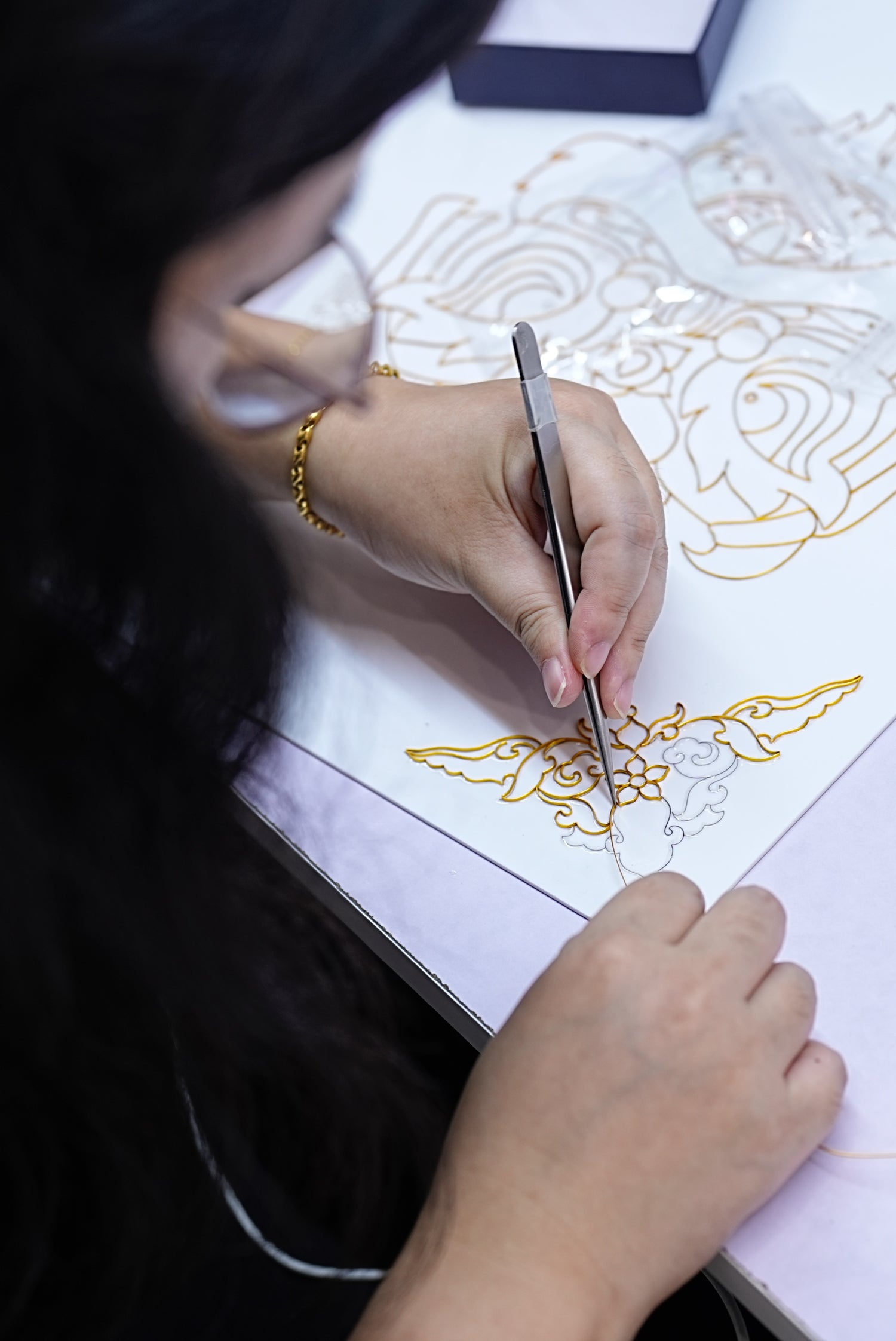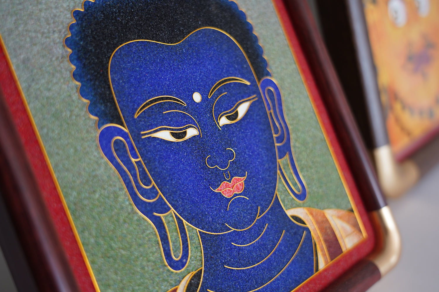 This is the core step in the cloisonné craft. Using extremely fine copper or gold wire, the artist manually bends and cuts each strand according to the lines of the original drawing. The strands are then glued or soldered to the baseboard. This process requires immense patience and precision, as each strand represents the outline and detail of the painting, forming the three-dimensional lines of the thangka.