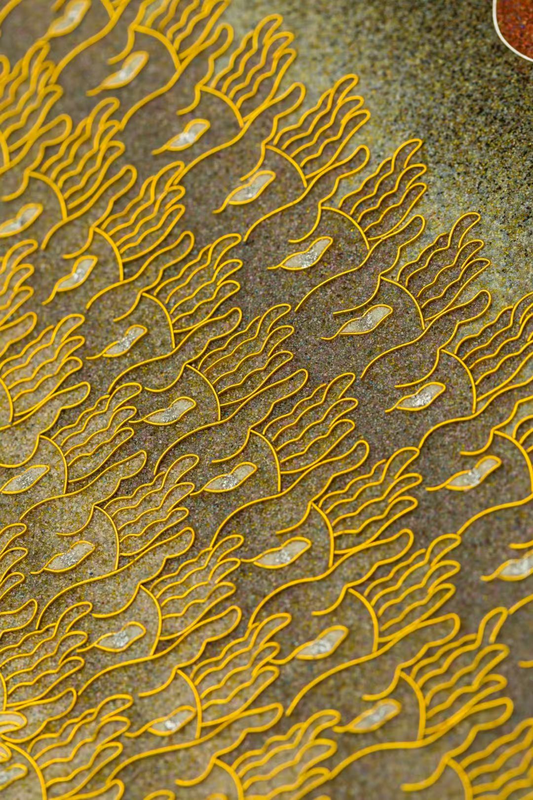 Thousand-armed and Thousand-eyed Guanyin is one of the incarnations of Guanyin's compassion and wisdom. It shows Guanyin's great compassion, protecting all living beings with a thousand hands and watching over the world with a thousand eyes. The Thousand-Armed and Thousand-Eyed Avalokiteshvara has its main two hands clasped together in front. On the right side, the three hands hold a prayer bead, a Dharma wheel, and a fearlessness mudra, respectively. On the left, the three hands hold a lotus flower, a bow and arrow, and a pure water vase. The upper body is bare, while the lower body is draped in a long skirt. The figure is adorned with a mantle over its shoulders and decorated with a necklace, long chains, earrings, bracelets, and armbands.