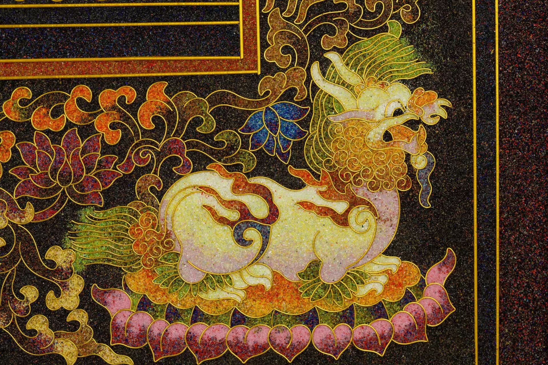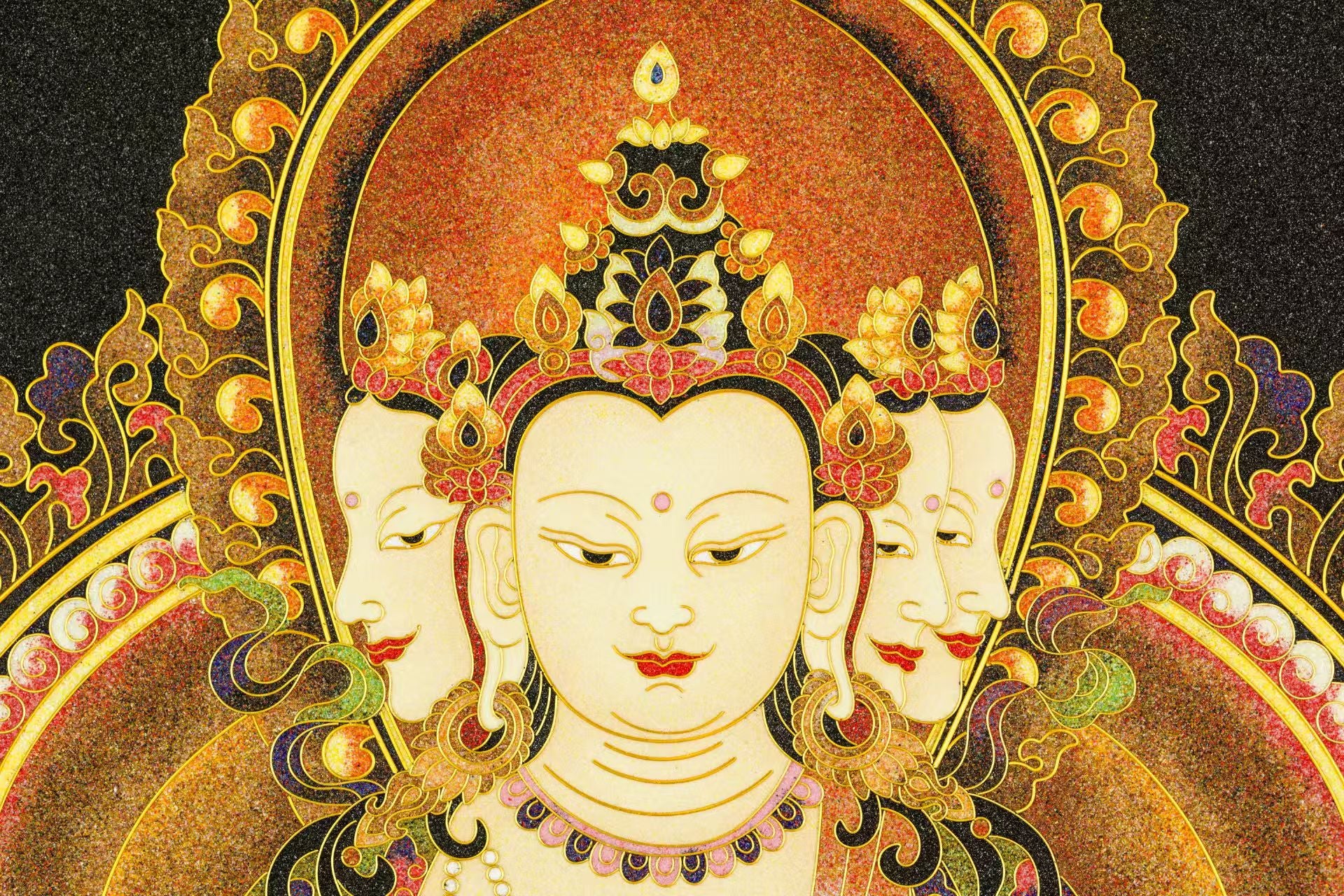 The principal deity, Mahavairocana Buddha, occupies the center of the painting, depicted with four faces. His hair is gathered into a high topknot adorned with a five-petaled crown. The central face bears a solemn expression, while the other faces display varying emotions—some joyful, some wrathful. His upper body is robust and adorned with various ornaments, his hands forming the mudra of meditation before his abdomen. He wears a loose, flowing robe, seated in the lotus position upon a lotus throne.