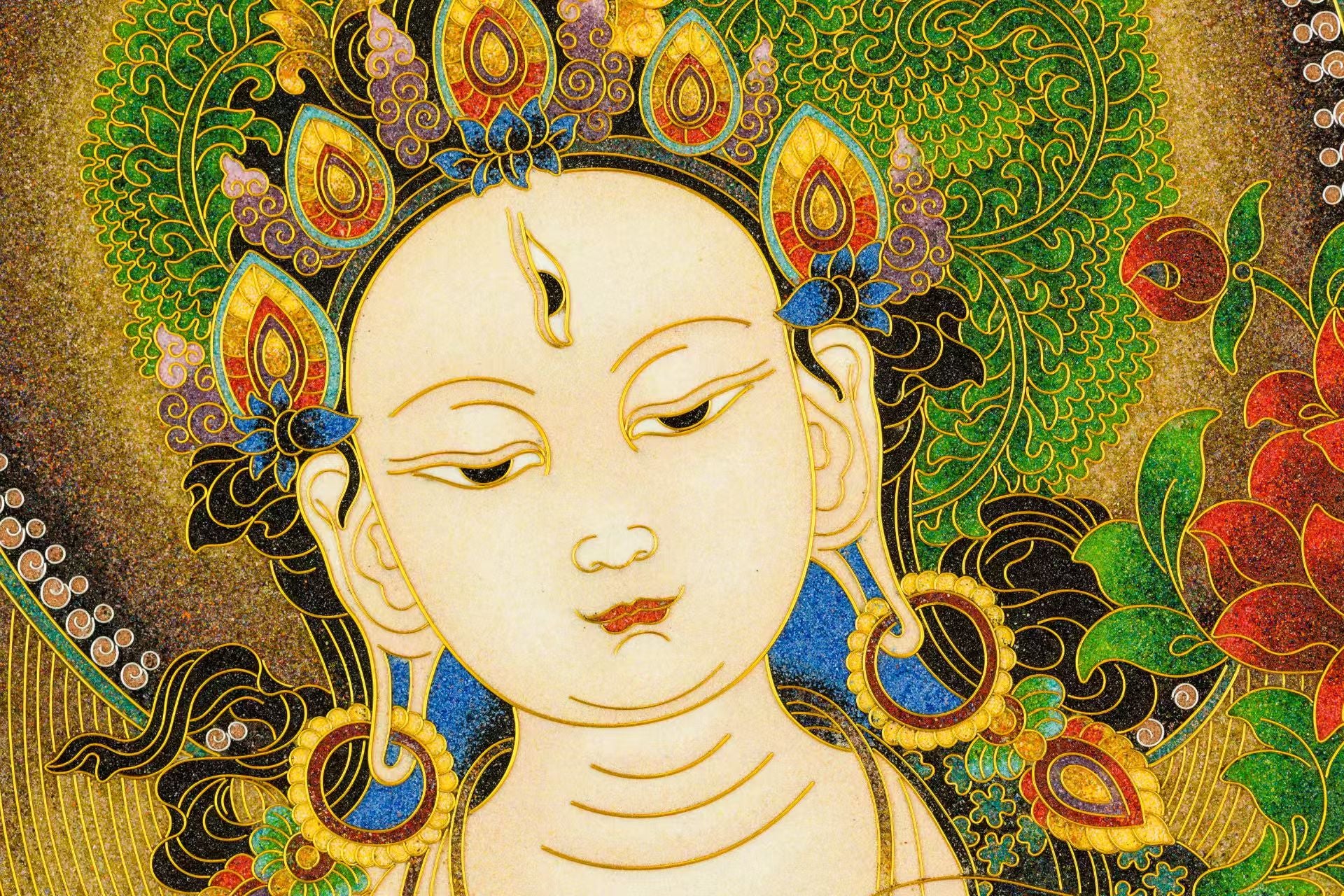 White Tara's nature is gentle and kind, and she is exceptionally wise; no secret can be hidden from her. People always seek her aid, which is why she is also called the Goddess of Deliverance (or Savior).